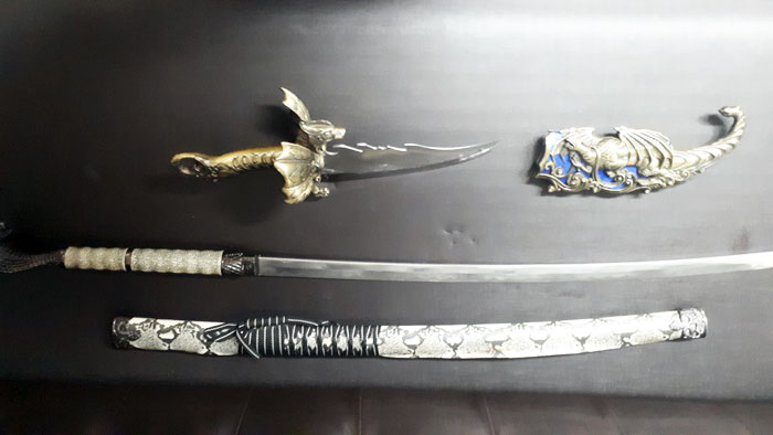 Κατασχέθηκαν μαχαίρια και σπαθιά, ενώ είχε στην κατοχή του και λαθραία τσιγάρα.